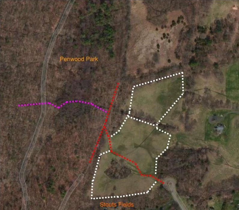 Trail begins directly off of the cul-de-sac. There are two fields with linking bridges where a stream divides them. As you proceed up the main trail head north along the edge of the field into the north field. From there either complete a clock wise loop or proceed to an old country road which will connect to the Penwood Park red trail.